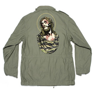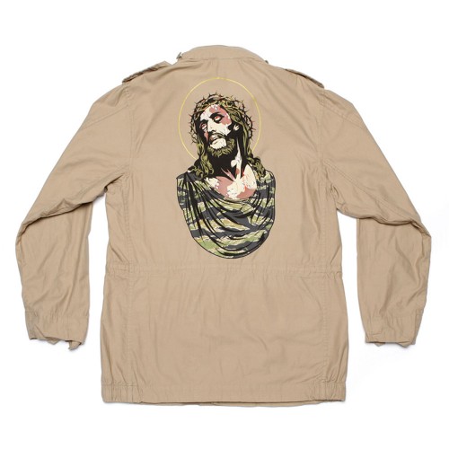 SSUR drops another Spring 2013 release, their camo jacket. The jacket has an image of Jesus on the back of it. It comes in three color, Black, Sage, and Khaki check it out.
